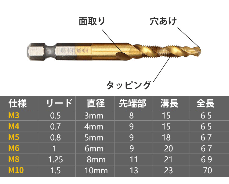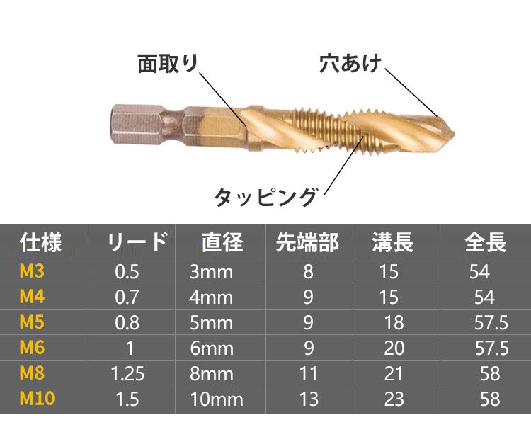 ドリルビット6本が並んだ画像